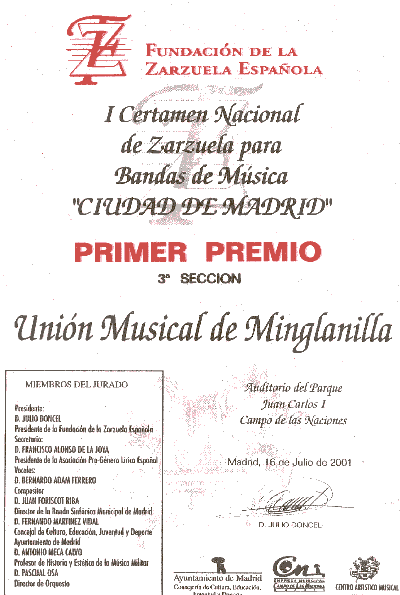 PRIMER PREMIO DE ZARZUELA CIUDAD DE MADRID. AÑO 2001 La fundación de la Banda Municipal de Música tuvo lugar en el año 1884 y fue gracias a D. Natalio, músico vecino de la localidad. A partir de 1912 surge la separación y la división de la banda, dando lugar a dos nuevas bandas de música: La Banda del Romeral, llamada cariñosamente "La de Arriba", que era dirigida por músicos aficionados, y la Banda Cantalapiedra, o "La de Abajo" , dirigida por músicos profesionales. Al término de la Guerra Civil, por gestión de las Autoridades municipales estas dos bandas se fusionaron en 1940, surgiendo la Banda Municipal de Minglanilla. Entre sus éxitos cabe destacar: -Primer Premio en el Certamen Comarcal de Motilla del Palancar (1954) -Segundo Premio en el Certamen Provincial de Cuenca. -Primer Premio en el Certamen Provincial de Cuenca (1963) -Tercer Premio en el Certamen Comarcal de Tomelloso (1975) -Primer Premio en el Certamen Comarcal de Motilla del Palancar (1983) A partir de la fusión de las dos bandas ha tenido los siguientes Directores:, Don Celestino Martínez, D. Luis Gil Carpena, D. Antonio Zamorano Donoso, D. Daniel Martinez Martín, D. José Centelles, D. Ciro Rodriguez Perelló, D. Jose Angel Zahonero Ballesteros, D. Miguel Calero Navalón, D. Hector Ignacio Martínez Díez y Do. Manuel Roda Redondo. En la actualidad esta agrupación está basada en la Sociedad Cultural "Centro Artístico Musical de Minglanilla, con sesenta y dos músicos en plantilla, la Banda Juvenil con cincuenta músicos, y diversos grupos camarísticos (quinteto de viento, quinteto de metal, cuarteto de saxofones y otros) A partir de noviembre de 2011 se hace cargo de la Banda D. Enrique Martínez Gonzalo, quien cursó estudios de nivel elemental en la escuela de música de la Unión Musical Utielana, de grado medio en Buñol y Almansa, y de grado superior en Valencia y Murcia, obteniendo las mejores calificaciones en Clarinete. De entre las últimas actuaciones de la Banda Unión Musical de Minglanilla, cabe destacar su reciente participación en la "PRIMERA Muestra de Artes Escénicas de Castilla la Mancha",en diferentes Festivales de Bandas en la Comunidad Castellanomanchega, así como en la Comunidad Valenciana. En la actualidad asume la Presidendia del Centro Artístico Musical de Minglanilla D. Miguel Ángel Martínez García. |
